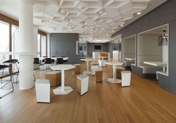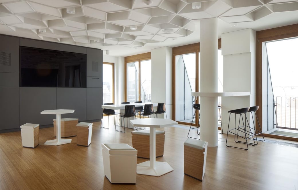Flexible Sitzmöbel, wie ausziehbare Bänke und Tische sowie Tisch-Hocker-Kombinationen, die frei arrangiert werden können, ermöglichen ein schnelles Freiräumen der Etage für Veranstaltungen und Meetings.