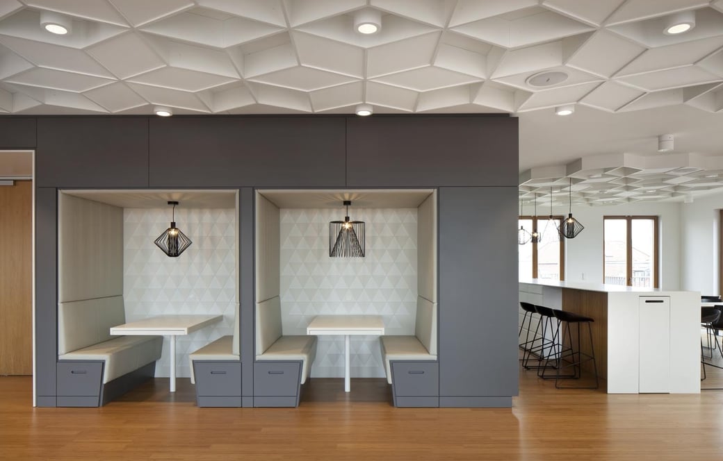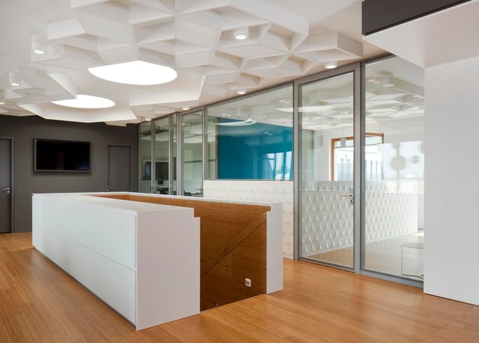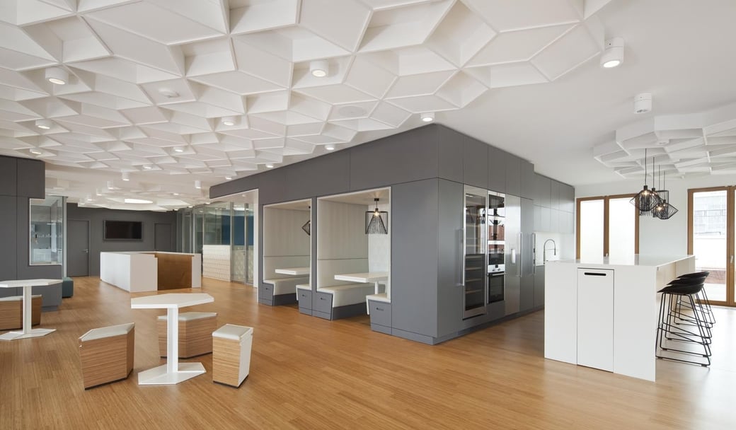 Die Akustikdecke setzt sich aus offenen und geschlossenen Wabenelementen zusammen und wurde eigens für die Räume entwickelt und angefertigt. Beleuchtung und elektonische Geräte sind in die Struktur integriert.
