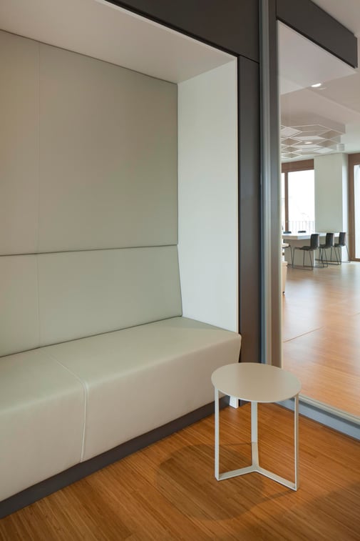 Der große Raum wird durch eingestellte raumhohe Objekte in Bereiche unterschiedlicher Funktionen unterteilt. Verschiedene Sitzmöglichkeiten ermöglichen unterschiedliche Arten der Kommunikation - vom informellen Meeting bis zur lockeren Pause.