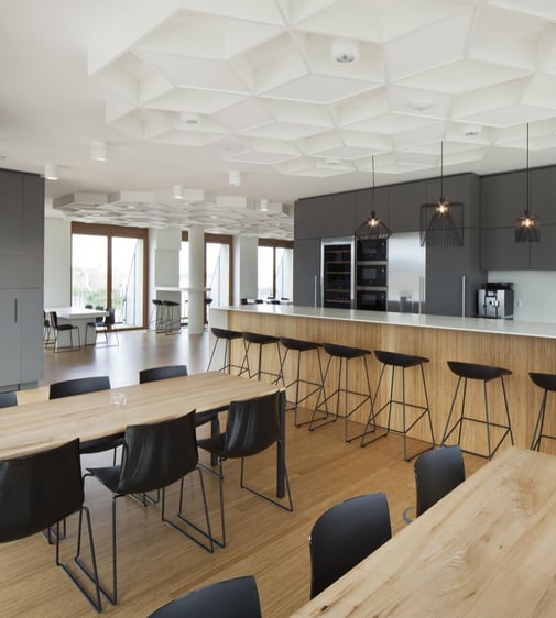 In der an der Terrasse gelegenen Teamküche mit frei stehendem Küchenblock kann zusammen gekocht und gegessen werden.