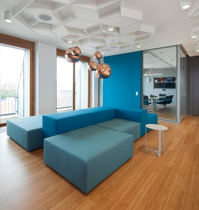 Im Dachgeschoss des Bürogebäudes in der Schumannstraße in Berlin Mitte ist eine neue Break-Out-Area mit Teamküche und Café, Rezeption, Lounge und Konferenzräumen für Mitarbeiter und Gäste der Audible GmbH entstanden.