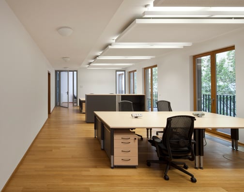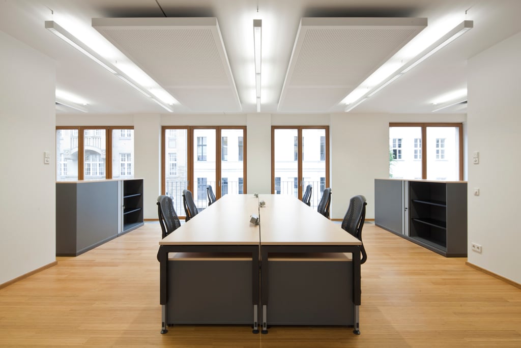 den Arbeitsbereichen. Das Deckenraster aus Paneelen und Leuchten ist auf die Möblierung abgestimmt.