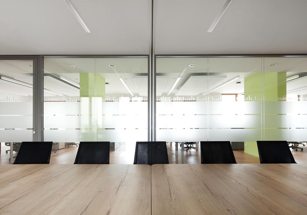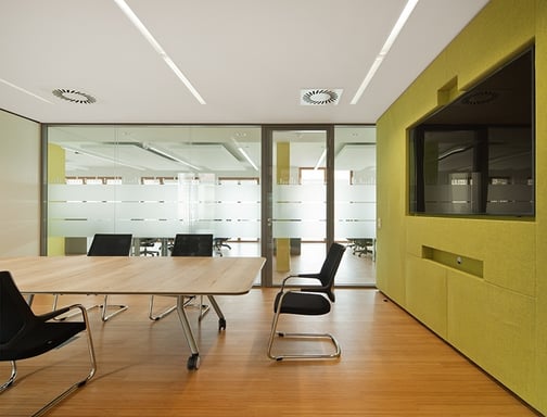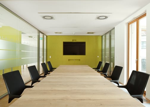In den Konferenzräumen befinden sich mit Akustiktextilien bezogene Medienwände, welche mit großformatigen Bildschirmen und Video-Konferenzsystemen ausgestattet sind.