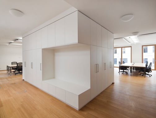 Die offenen Großraumbüros werden durch frei im Raum stehende Kuben zoniert. Diese beinhalten Konferenzräume, Garderobenmöbel, Teeküchen und Stauraum.
