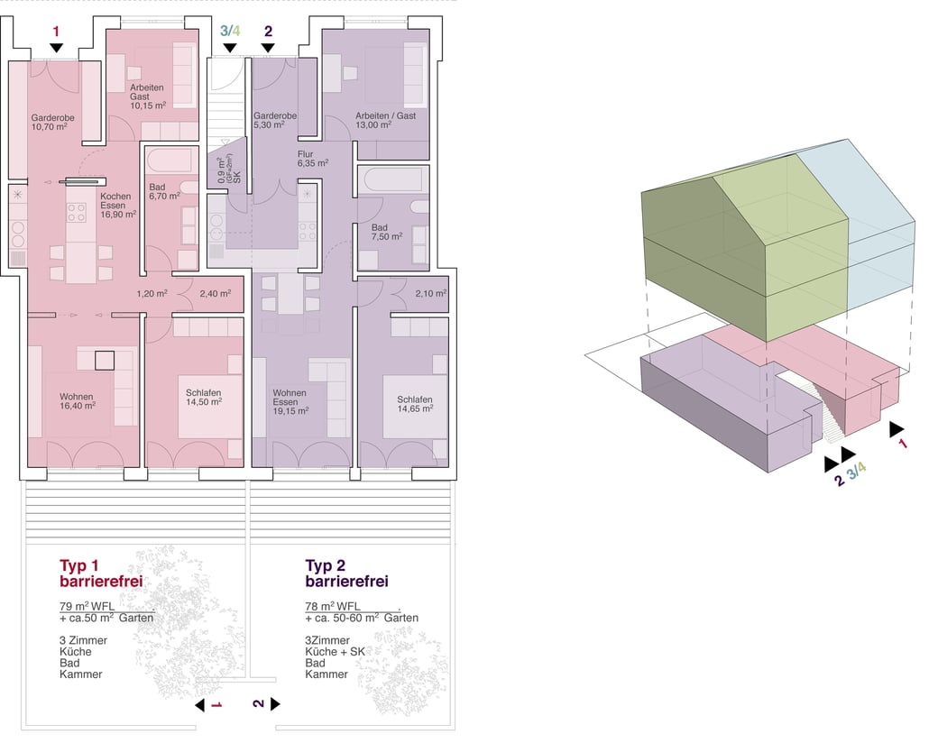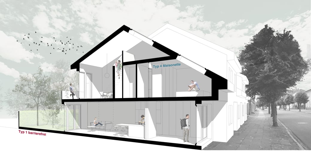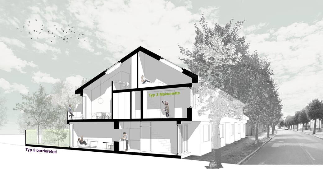 Die Reihenraustypologie umfasst 6 ebenerdige altersgerechte Wohnungen mit Garten im Erdgeschoss und 7 darüber liegenden Maisonettewohnungen im 1. und 2. Obergeschoss.