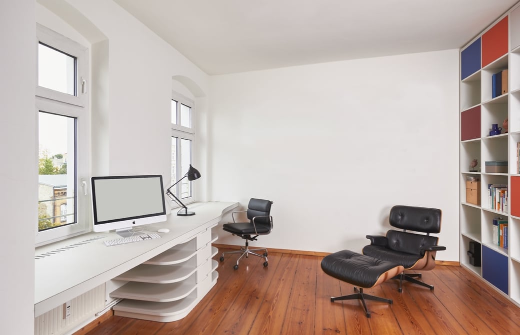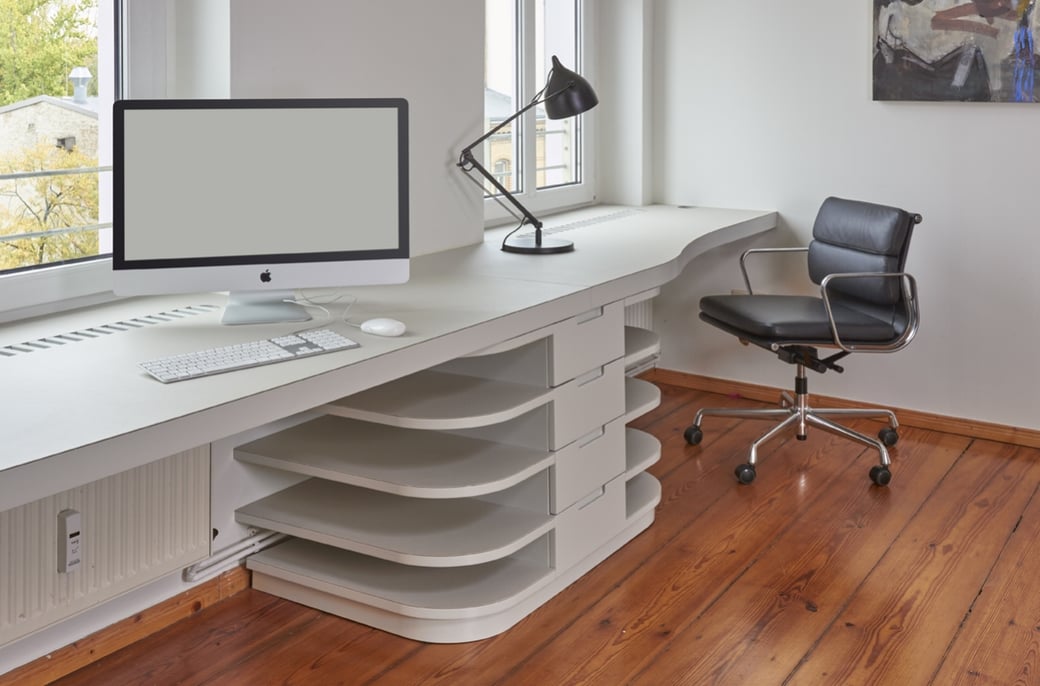 Für das Arbeitszimmer wurde ein Doppelarbeitsplatz vor dem Fester entwickelt. Integrierte Auszüge und Ablagen schaffen Platz für den Drucker sowie Büro-, Bastel- und Nähmaterial. Das raumhohe Wandregal bietet mit seinen geschlossenen und offenen Elementen weitere Staumöglichkeiten.